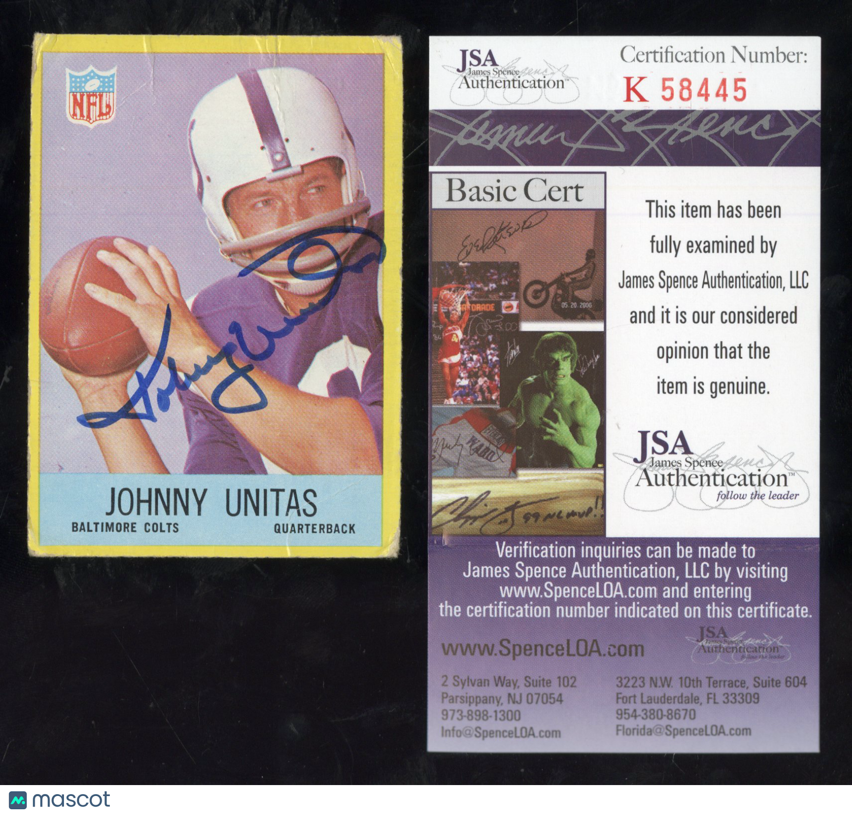 You are purchasing a 1967 Philadelphia Johnny Unitas #24 Hand Signed Auto Poor JSA Authenticated. You will receive the exact item in the photographs. Thank you for looking. COMBINED SHIPPING: We offer combined shipping on all items, after first auction won, each item after will be 0.50 extra. Please make sure to wait for payment till you receive an invoice. Paying before invoice will not give you the discount. LOCAL PICKUP: We offer local pickup for all items, at checkout make sure to select local pickup. Listed With Mascot.