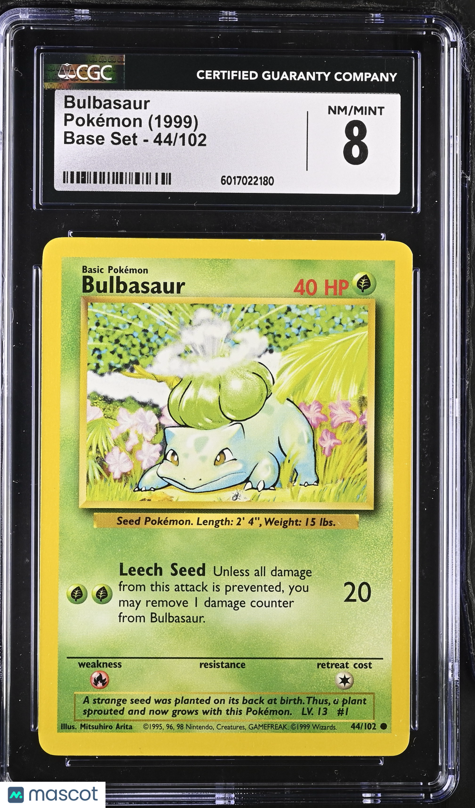 You are purchasing a 1999 Pokémon Bulbasaur #44/102 CGC 8. You will receive the exact item in the photographs. Thank you for looking. Listed With Mascot.