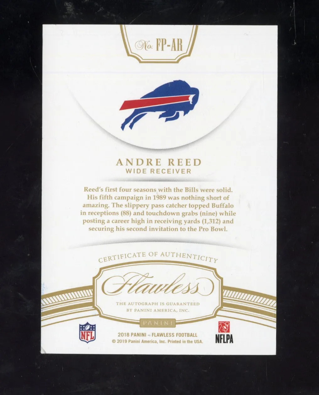 You are purchasing a 2018 Panini Flawless Football Penmanship Andre Reed #FP-AR Auto 2/2. You will receive the exact item in the photographs. Thank you for looking. COMBINED SHIPPING: We offer combined shipping on all items, after first auction won, each item after will be 0.50 extra. Please make sure to wait for payment till you receive an invoice. Paying before invoice will not give you the discount. LOCAL PICKUP: We offer local pickup for all items, at checkout make sure to select local pickup. Listed With Mascot.