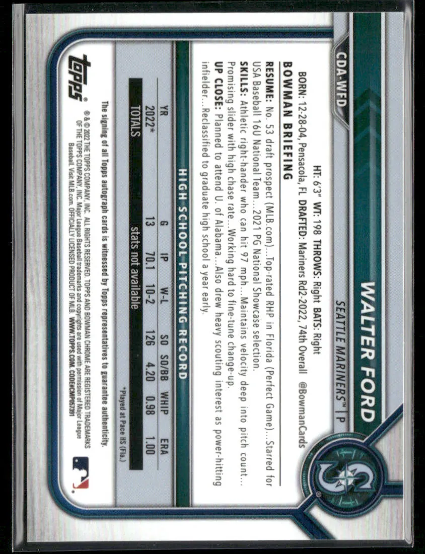 You are purchasing a 2022 Bowman Draft Chrome Walter Ford #CDA-WFO RayWave Refractor Auto. You will receive the exact item in the photographs. Thank you for looking. COMBINED SHIPPING: We offer combined shipping on all items, after first auction won, each item after will be 0.50 extra. Please make sure to wait for payment till you receive an invoice. Paying before invoice will not give you the discount. LOCAL PICKUP: We offer local pickup for all items, at checkout make sure to select local pickup. Listed With Mascot.