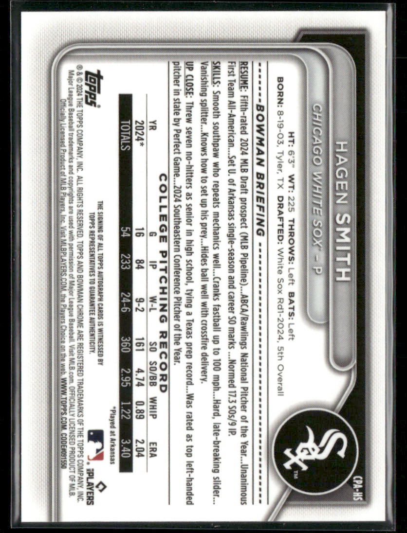 You are purchasing a 2024 Bowman Draft Hagen Smith #CPA-HS Chrome Auto. You will receive the exact item in the photographs. Thank you for looking. COMBINED SHIPPING: We offer combined shipping on all items, after first auction won, each item after will be 0.50 extra. Please make sure to wait for payment till you receive an invoice. Paying before invoice will not give you the discount. LOCAL PICKUP: We offer local pickup for all items, at checkout make sure to select local pickup. Listed With Mascot.