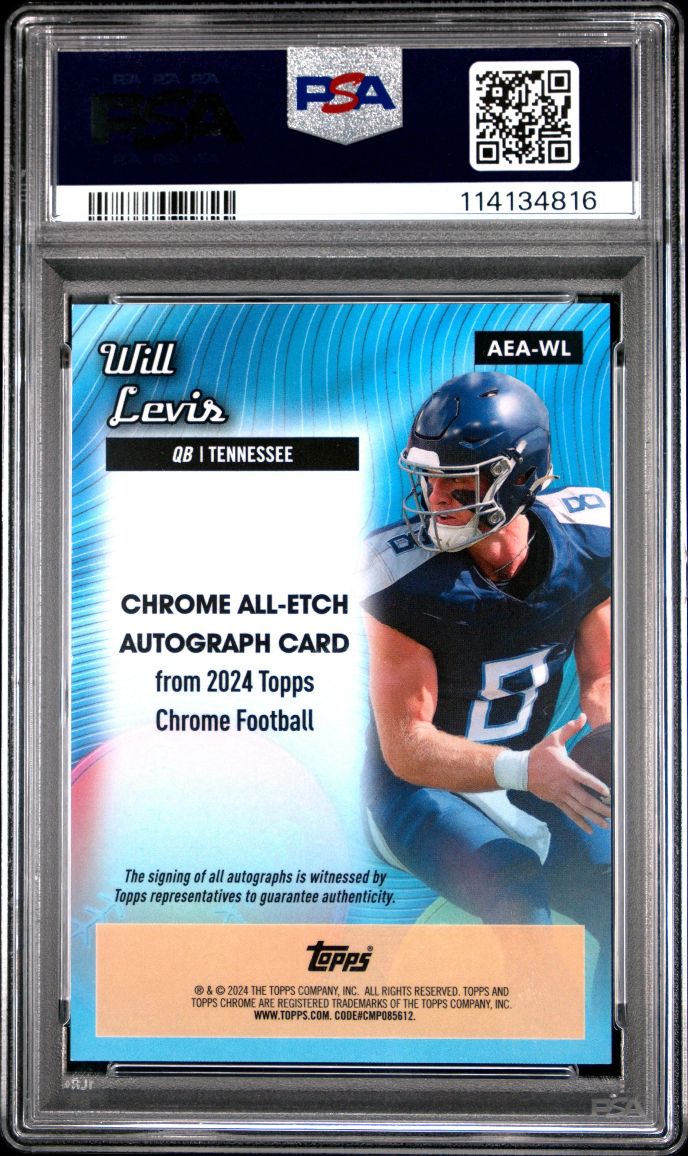 You are purchasing a 2024 Topps Chrome All-Etch Auto Will Levis #AEA-WL Blue Refractor 053/150 PSA 9. You will receive the exact item in the photographs. Thank you for looking. COMBINED SHIPPING: We offer combined shipping on all items, after first auction won, each item after will be 0.50 extra. Please make sure to wait for payment till you receive an invoice. Paying before invoice will not give you the discount. LOCAL PICKUP: We offer local pickup for all items, at checkout make sure to select local pickup. Listed With Mascot.