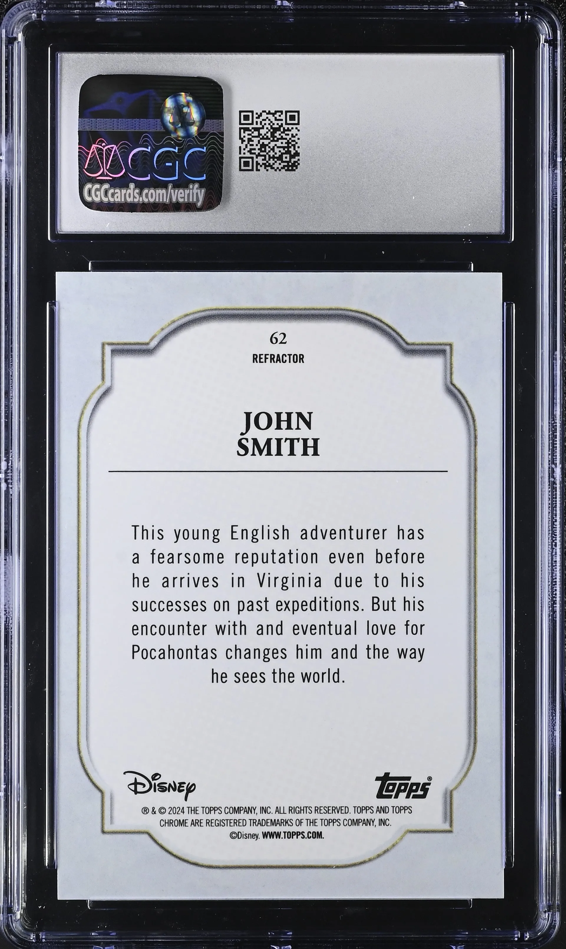 You are purchasing a 2024 Topps Chrome Disney John Smith Refractor #62 CGC 9.5. You will receive the exact item in the photographs. Thank you for looking. Listed With Mascot.