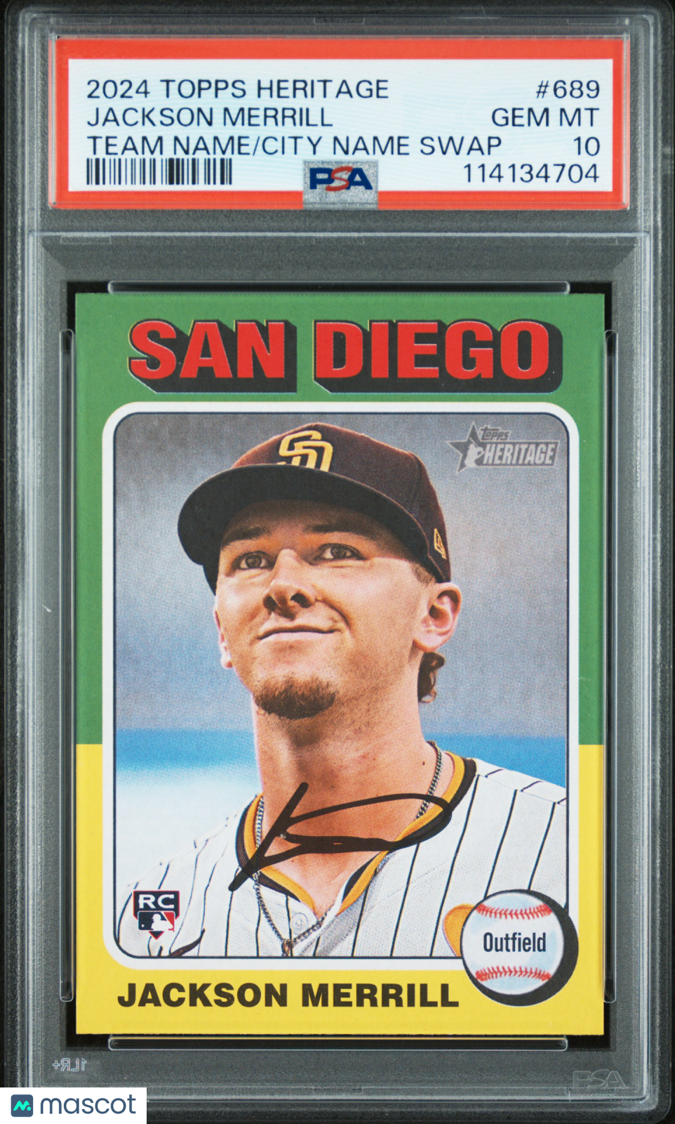 You are purchasing a 2024 Topps Heritage Jackson Merrill #689 Team Name City Name Swap Rookie PSA 10. You will receive the exact item in the photographs. Thank you for looking. COMBINED SHIPPING: We offer combined shipping on all items, after first auction won, each item after will be 0.50 extra. Please make sure to wait for payment till you receive an invoice. Paying before invoice will not give you the discount. LOCAL PICKUP: We offer local pickup for all items, at checkout make sure to select local pickup. Listed With Mascot.