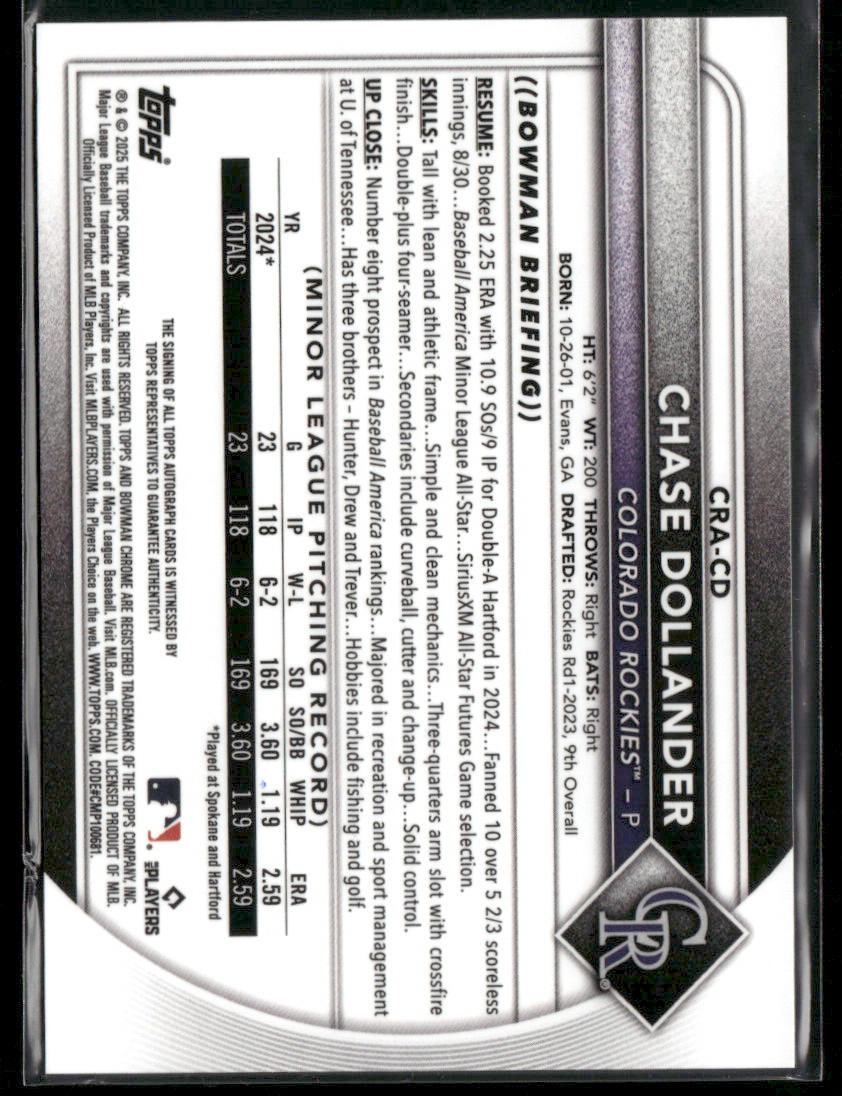 You are purchasing a 2025 Bowman Chrome Chase Dollander #CRA-CD RC Rookie Auto RC Rookie Auto. You will receive the exact item in the photographs. Thank you for looking. COMBINED SHIPPING: We offer combined shipping on all items, after first auction won, each item after will be 0.50 extra. Please make sure to wait for payment till you receive an invoice. Paying before invoice will not give you the discount. LOCAL PICKUP: We offer local pickup for all items, at checkout make sure to select local pickup. Listed With Mascot.