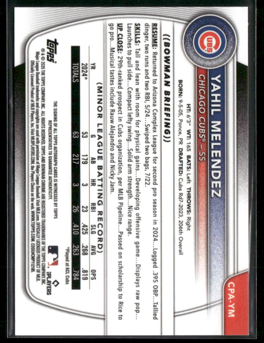 2025 Bowman Chrome Yahil Melendez #CPA-YM Blue 1st Bowman Auto 089/150 (BT)