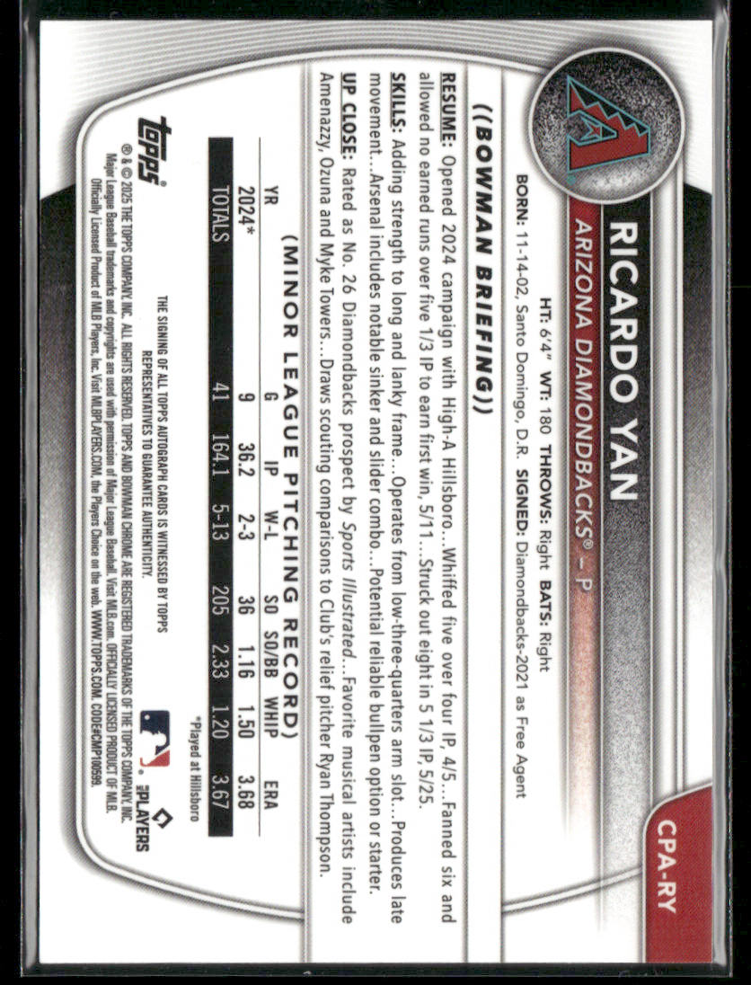 You are purchasing a 2025 Bowman Ricardo Yan #CPA-RY Mini Diamond 1st Bowman Auto Chrome 060/100. You will receive the exact item in the photographs. Thank you for looking. COMBINED SHIPPING: We offer combined shipping on all items, after first auction won, each item after will be 0.50 extra. Please make sure to wait for payment till you receive an invoice. Paying before invoice will not give you the discount. LOCAL PICKUP: We offer local pickup for all items, at checkout make sure to select local pickup. Listed With Mascot.