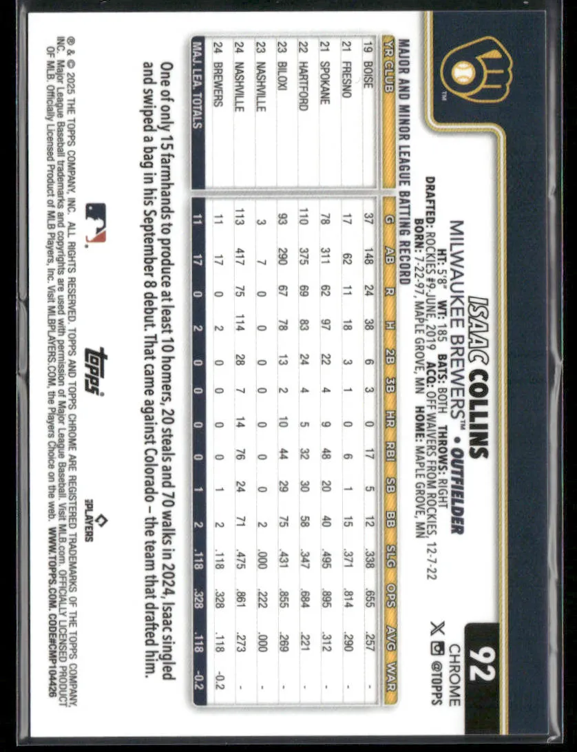 You are purchasing a 2025 Topps Chrome Isaac Collins #92 Gold Geometric RC Rookie 41/50. You will receive the exact item in the photographs. Thank you for looking. COMBINED SHIPPING: We offer combined shipping on all items, after first auction won, each item after will be 0.50 extra. Please make sure to wait for payment till you receive an invoice. Paying before invoice will not give you the discount. LOCAL PICKUP: We offer local pickup for all items, at checkout make sure to select local pickup. Listed With Mascot.
