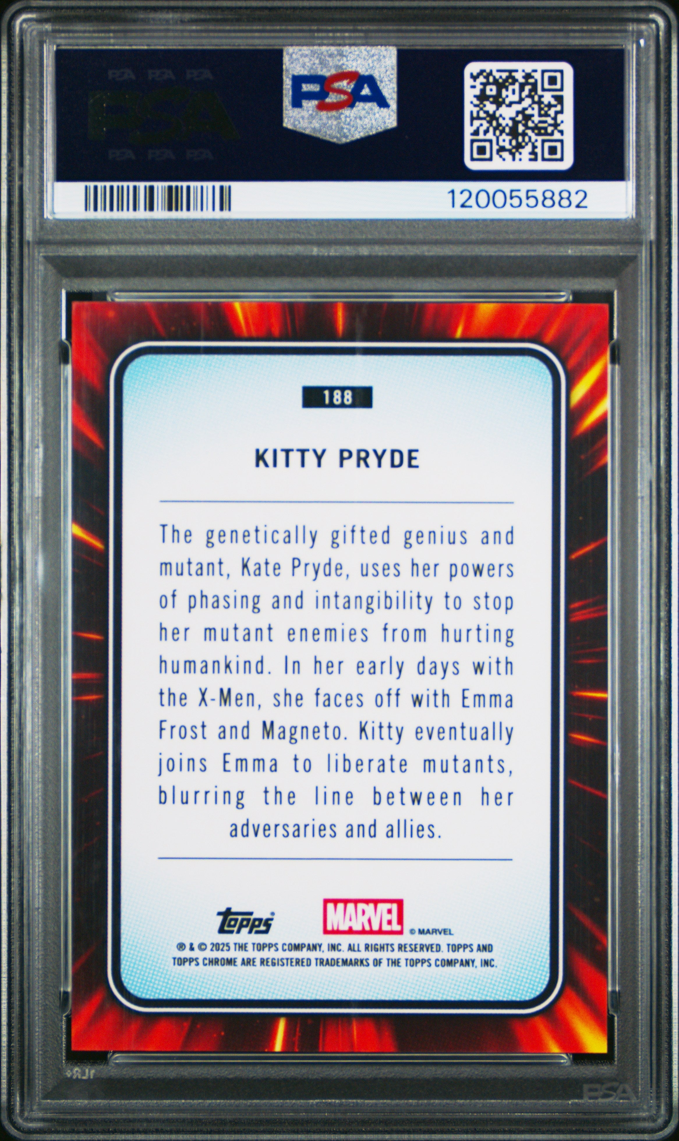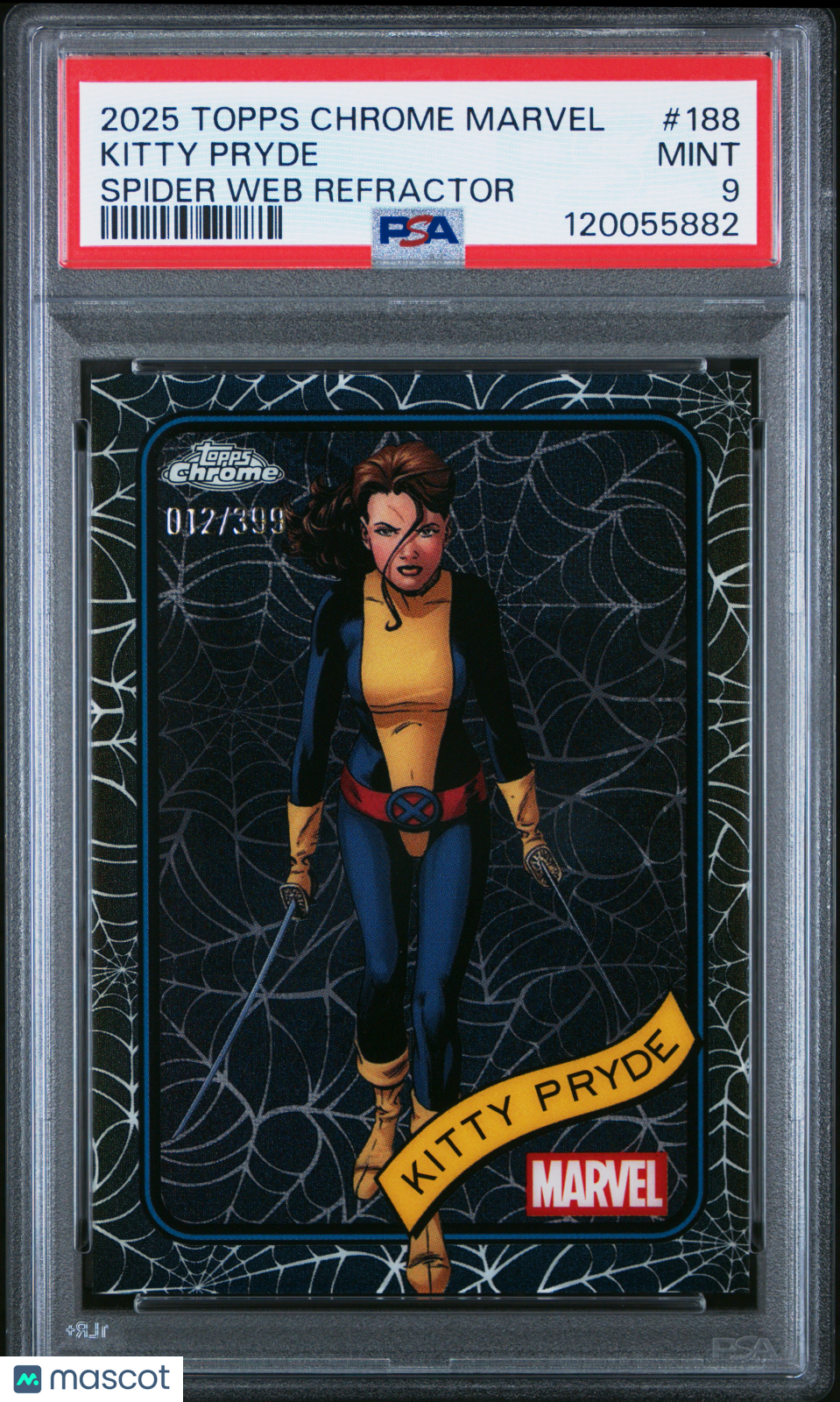 You are purchasing a 2025 Topps Chrome Marvel Kitty Pryde Spider Web Refractor 012/399 #188 PSA 9. You will receive the exact item in the photographs. Thank you for looking. Listed With Mascot.