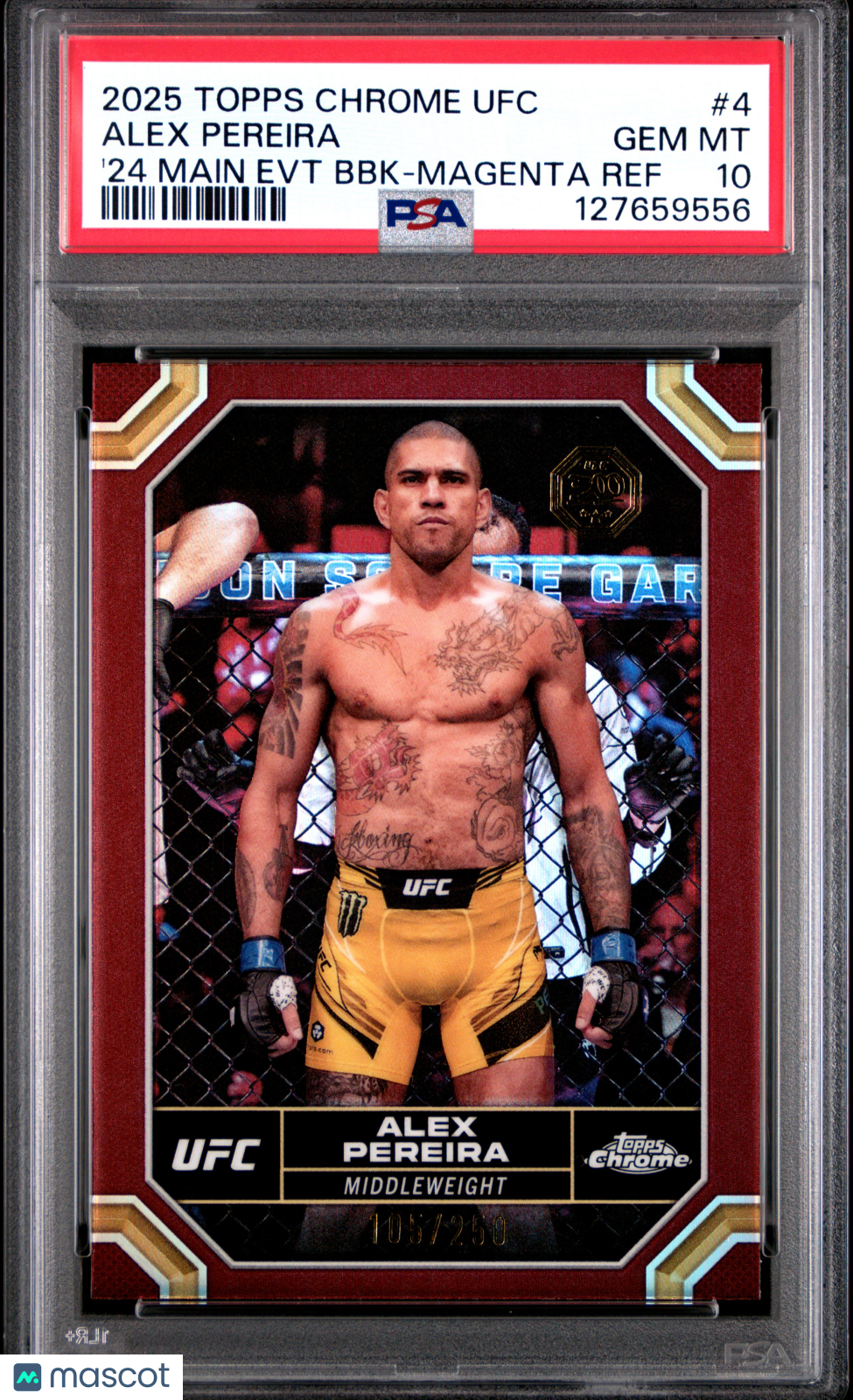 You are purchasing a 2025 Topps Chrome UFC 2024 Main Event Buyback Alex Pereira #4 105/250 PSA 10. You will receive the exact item in the photographs. Thank you for looking. COMBINED SHIPPING: We offer combined shipping on all items, after first auction won, each item after will be 0.50 extra. Please make sure to wait for payment till you receive an invoice. Paying before invoice will not give you the discount. LOCAL PICKUP: We offer local pickup for all items, at checkout make sure to select local pickup. Listed With Mascot.