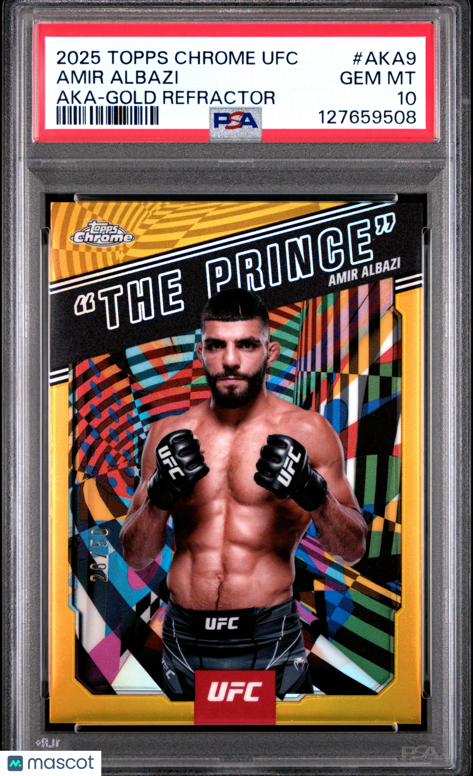 You are purchasing a 2025 Topps Chrome UFC AKA Amir Albazi #AKA-9 Gold Refractor 28/50 PSA 10. You will receive the exact item in the photographs. Thank you for looking. COMBINED SHIPPING: We offer combined shipping on all items, after first auction won, each item after will be 0.50 extra. Please make sure to wait for payment till you receive an invoice. Paying before invoice will not give you the discount. LOCAL PICKUP: We offer local pickup for all items, at checkout make sure to select local pickup. Listed With Mascot.