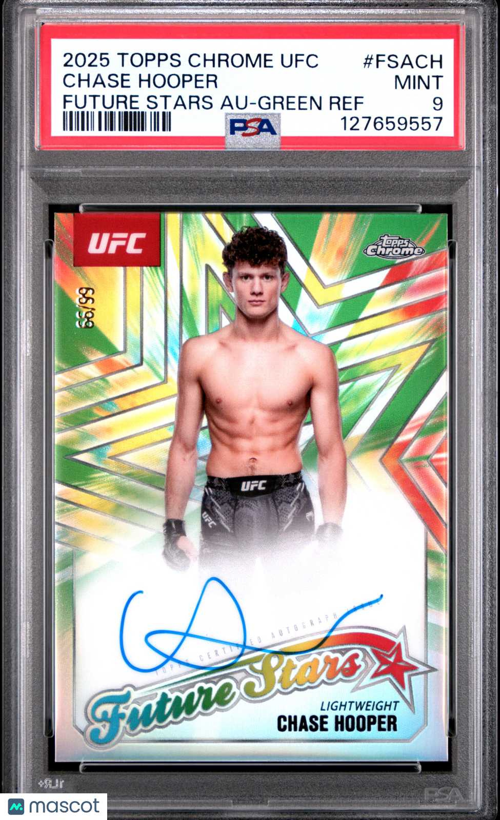 You are purchasing a 2025 Topps Chrome UFC Future Stars Auto Chase Hooper #FSA-CH Green 66/99 PSA 9. You will receive the exact item in the photographs. Thank you for looking. COMBINED SHIPPING: We offer combined shipping on all items, after first auction won, each item after will be 0.50 extra. Please make sure to wait for payment till you receive an invoice. Paying before invoice will not give you the discount. LOCAL PICKUP: We offer local pickup for all items, at checkout make sure to select local pickup. Listed With Mascot.
